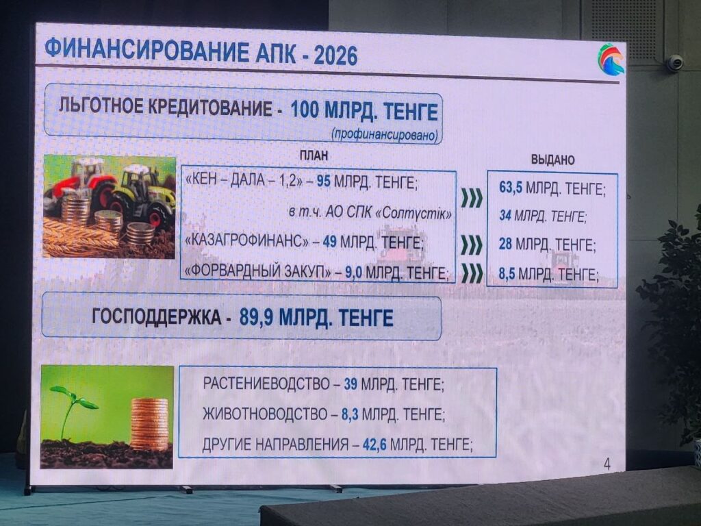 — Благодаря раннему финансированию, начатому с октября прошлого года, аграрии получили возможность заблаговременно подготовиться к предстоящему сезону. Приобрести семена, удобрения, топливо и обновить сельскохозяйственную технику. По программам «Кен Дала 1,2» уже выдали 63,5 млрд тенге. В том числе через СПК «Солтүстік» 34 млрд тенге. На обновление техники через АО «КазАгроФинанс» под льготную ставку 5% выделили 49 млрд тенге и выдали на 28 млрд тенге. На форвардный закуп через АО НК «Продкорпорация» профинансировали на сумму 8,5 млрд тенге, — сообщил М.Тасмаганбетов.